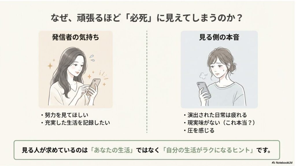 まずは「なぜ必死に見えるのか」を整理します。ここが分かると、無駄に消耗しないし、投稿の軸も作りやすくなります。あなたが悪いわけじゃなくて、見せ方・言い方・設計の問題のことが多いですよ。